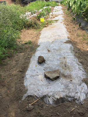 | 70度以上になるという、透明マルチの下で、雑草の種や虫の卵がなくなるらしい。 しかし、雑草の種がやられる前に、私自身が太陽熱吸収で、すぐピンチになった。 |