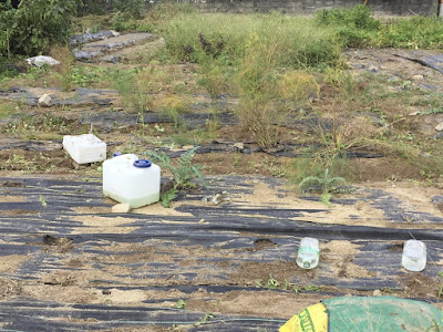 | 黒マルチを敷いて、種を蒔くまで数日を要したこの畝。 完全に赤ちゃんコオロギの寝床となって、出てきた芽が全て食べられた。 |