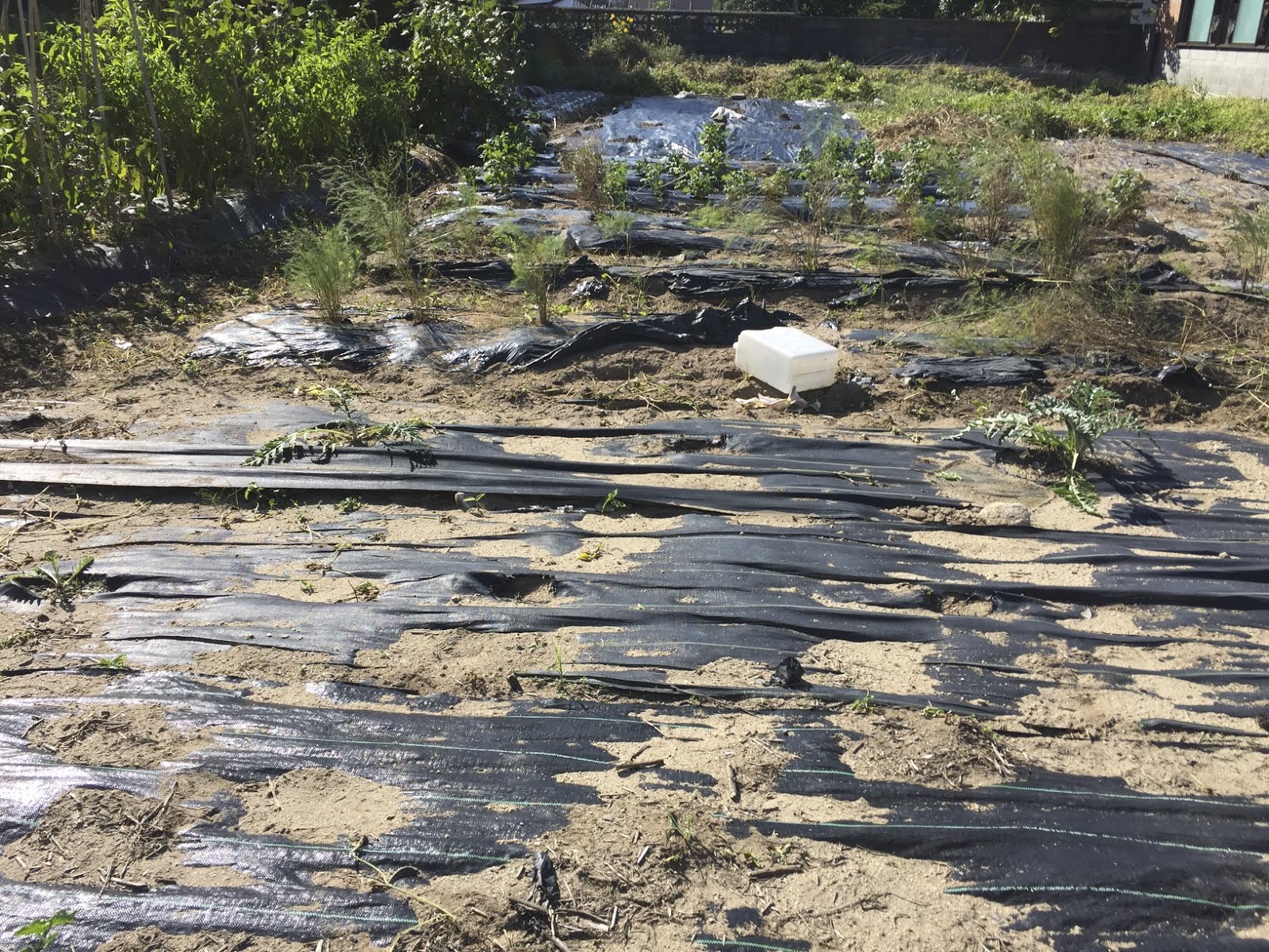 | 黒マルチを敷いて、種を蒔くまで数日を要したこの畝。 完全に赤ちゃんコオロギの寝床となって、出てきた芽が全て食べられた。 |
