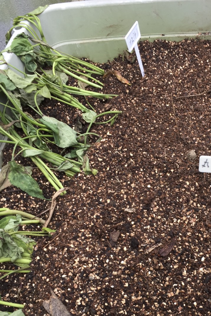 サツマイモは日陰のプランターや土嚢袋に挿し穂して、移植の時を待っている。