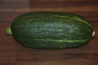 | こちらは長いズッキーニの収穫1本目。 これは、ヒョウタンの仲間なので、皮が硬い。 味は冬瓜とほぼ同じだ。 |