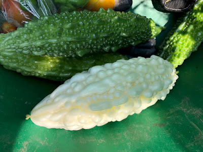 | 自家採種した種で育てているが、白いゴーヤだけは1本苗を買った。 |