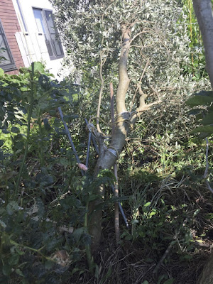 | その前の台風7号では、大きなオリーブの木も倒れた。 起こした後、今は立ち直って、付けていた多くの実も落ちていない。 |