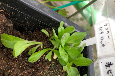 こんなロメインレタスも時間差で種を蒔いて、今の時期巻いているものから、一番小さな苗はまだポットの中でこんな感じ。
