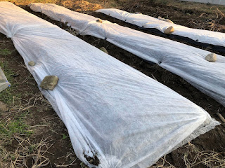 | こちらはデストロイヤー植え付け後の風景。 芽が出た後、霜にやられないように不織布をかけている。 |