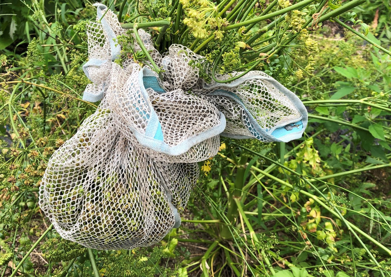 | 種を収穫する前、花ガラに集まるアカスジカメムシを予防している。 |
