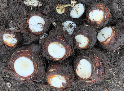 | 土の親芋も上部を切って逆さ植えにした。 |