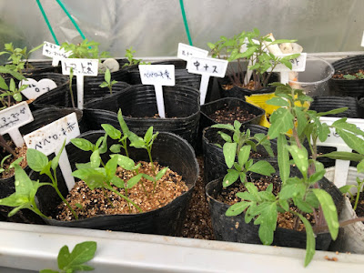 | トマトの苗は近日中に加温装置が付いた箱から不織布のトンネルの方に移動予定だ。 |