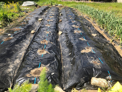 | 雑草被害が出ないように畝間もマルチで覆っている。 今日確認したら、いくつかがもう芽を出していた。 |