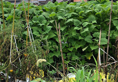 | ヤーコンは、このメインの畝以外にも数カ所で育てている。 で、毎年行っていた強風で倒れないような固定処置までは手が回らない。 |