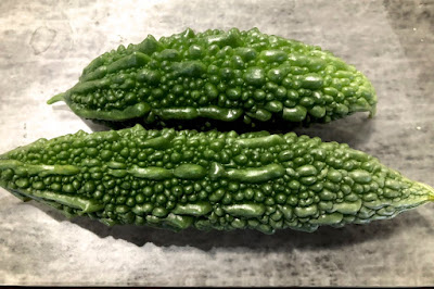 | こちらは嬉しいゴーヤの初収穫で、今夜の夕食にはゴーヤ料理が加わっていた。 |