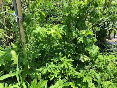 | ゴーヤが力負けするなんて信じられないが、ここではユウガオの勢いは凄い。 |