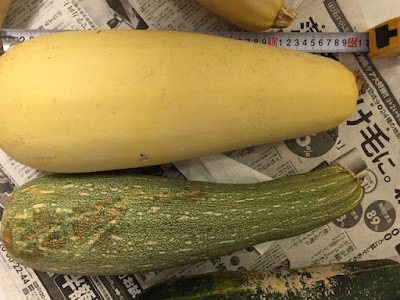 | 今日収穫した白ズッキーニを真ん中に置いた。 黄緑や緑のズッキーニと比較しても、この白ズッキーニが大きいことが分かる。 |
