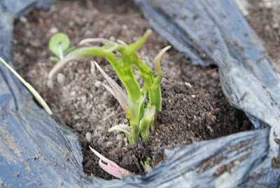 | いや〜元気の良さそうな芽が出てきた。こんな芽が3本程顔を出した。 この芽はこれからぐんぐん伸びてくる。支柱がもうじき必要になるはずだ。 |