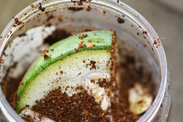 | ここに見えているのは冬瓜。 冬瓜を切った瞬間の出る液はみみずに毒性があることが分かっている。 それで冬瓜は大きな塊として与えることにした。 最終的には腐れかけのカボチャもかなり大量に与えた。 |