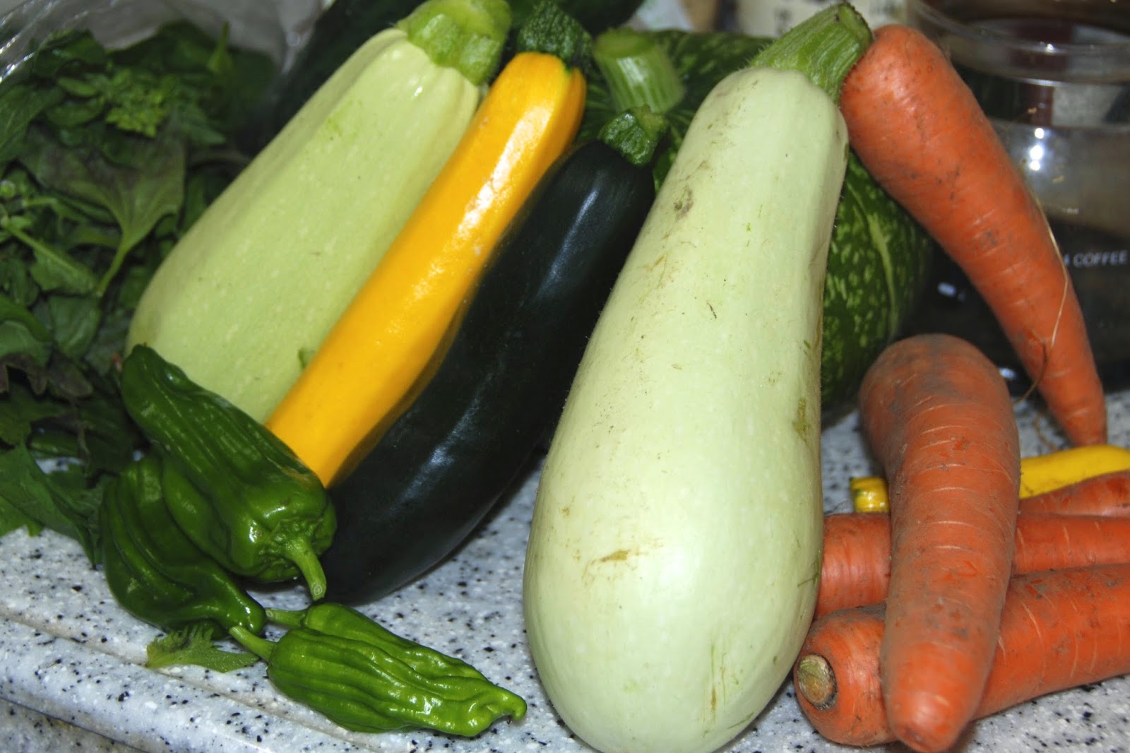 | 昨日は、ニンジン、シシトウ、ピーマン、緑ズッキーニが初収穫。 この時期のカボチャは柔らかくてとても美味しい。 左端にある葉っぱ野菜は大葉、ツルムラサキ、そしてバジルだ。 |