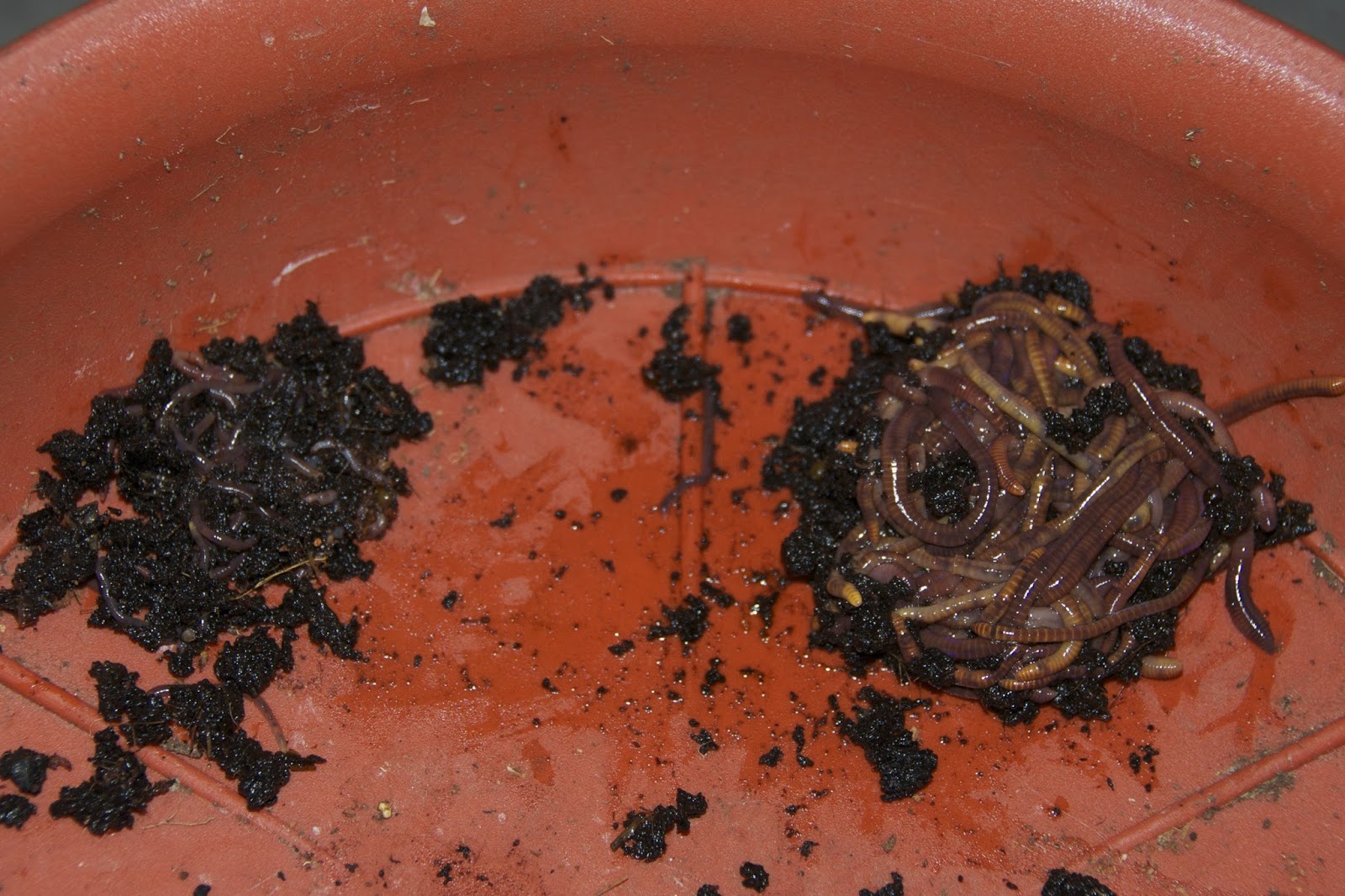 前回の様子。左の50匹の大人と別に子供ミミズがいたのだ。 |