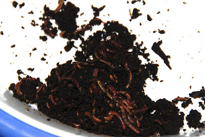 半分以上の内容量の堆肥を皿に移したところでやっと1匹目のみみずが顔を出した。