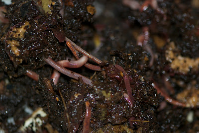 | よく見ると環帯の膨らんだ妊娠ミミズが居るがその数はそんなに多くない。 今回も観察小屋にミミズ君を戻し、食べ残しの餌や、里芋などを与えておいた。 |