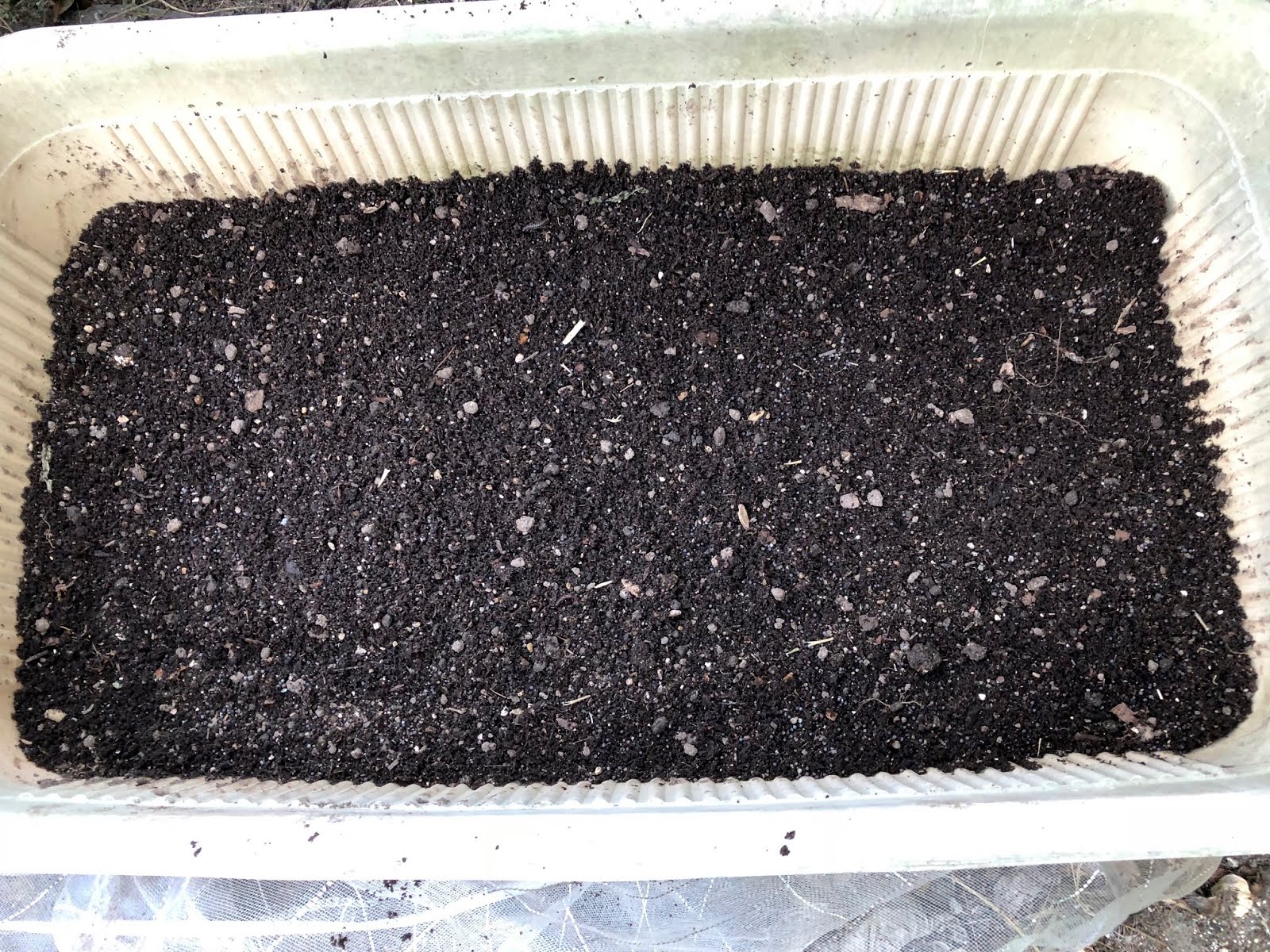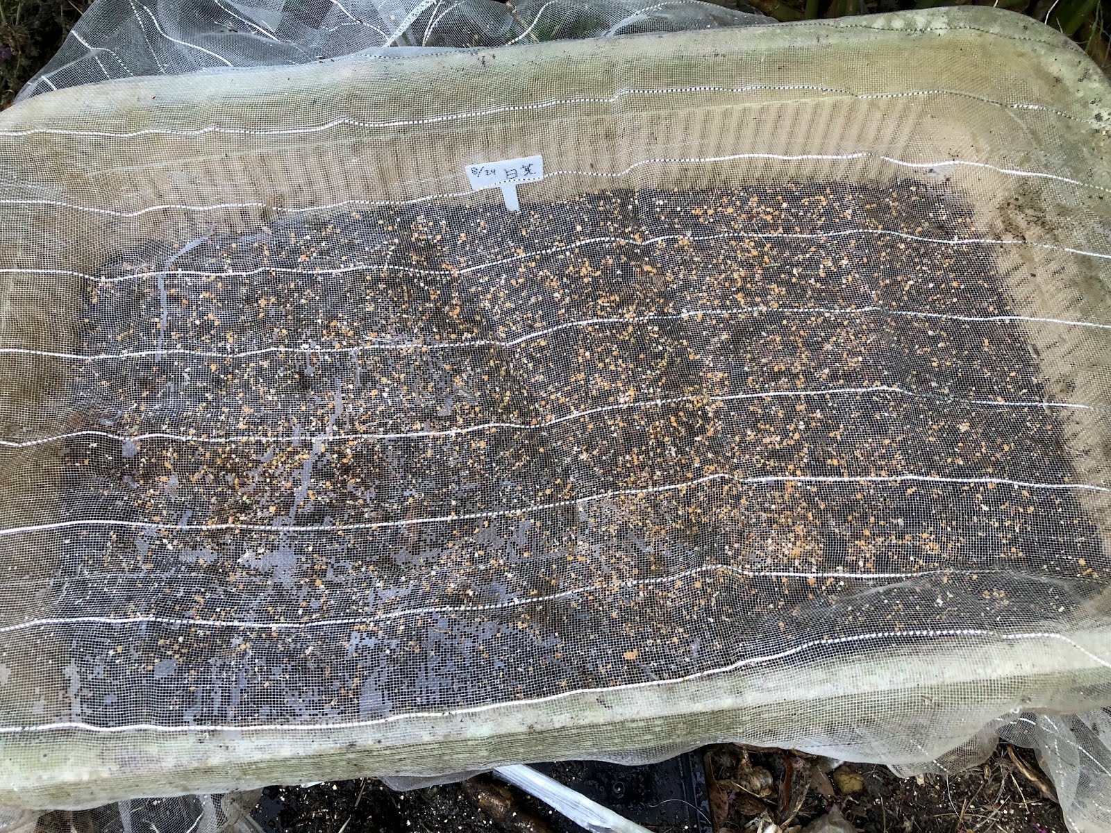 | プランターに種をバラ蒔きにして、防虫ネットを隙間がないように掛けている。 |