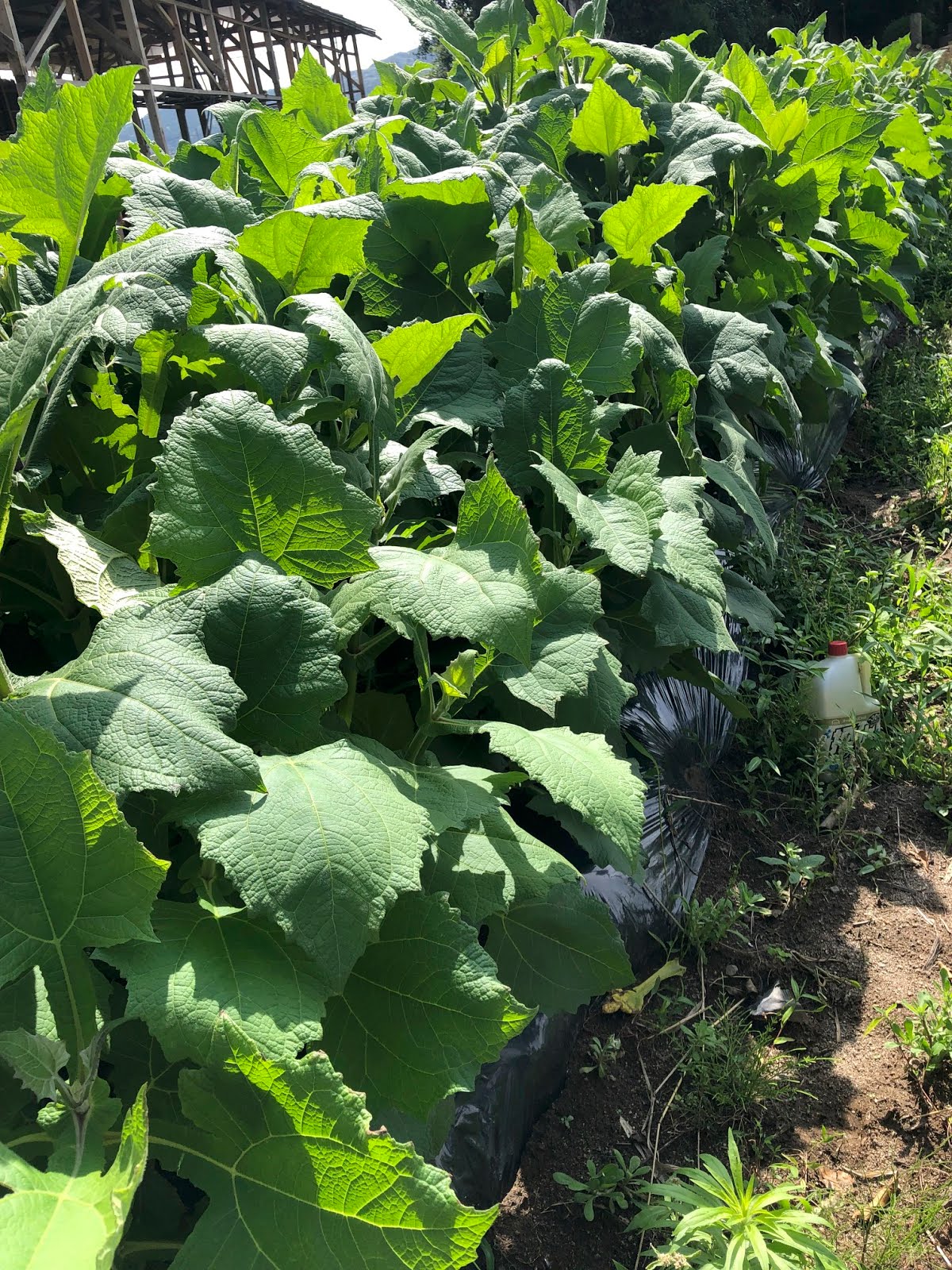 この畝に植え付けたヤーコンと別に、収穫忘れの種芋から自然発生したヤーコンの苗を側に植えていた。