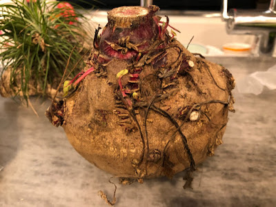 | こちらは今日食べたヤーコン。 この時期にヤーコンを食べたという話は聞いたことがない。 しかし、一番美味しい時期に比べたら、やはり食感は若干落ちていた。 |