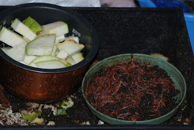 また、乾き気味のココナッツ繊維をまぶした冬瓜などの餌を十分与えて、640匹の大人ミミズを小屋に戻しておいた。