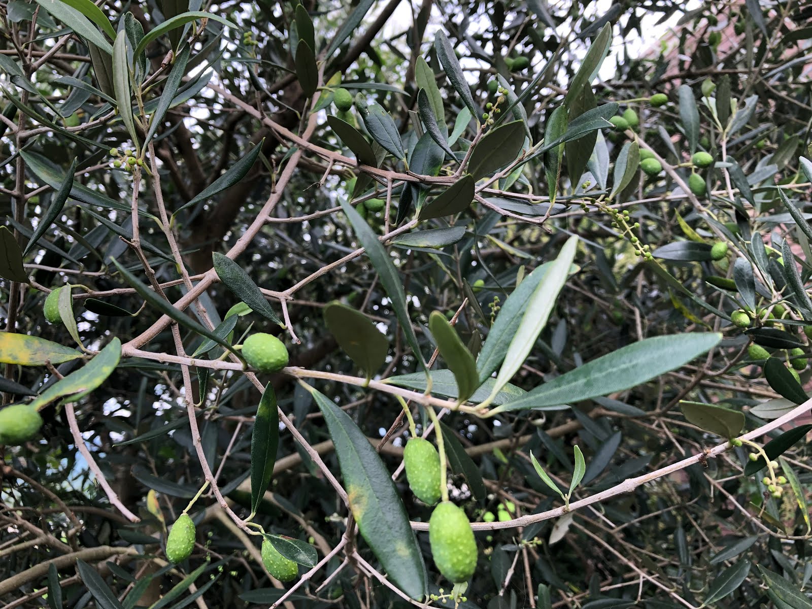 オリーブの木は、第1菜園の端の方に植えている2本が元気なので、今年も収穫はこの2本に任せよう。
