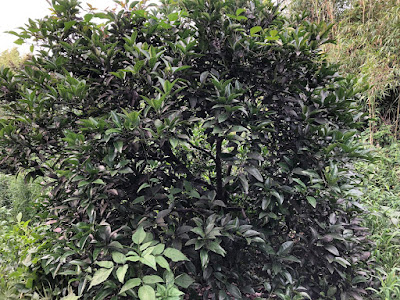 | 晩白柚の木に梅の枝が覆いかぶさったところでは、梅の枝を切り落とした。 どうもその程度では日の当たりがまだ悪いみたいだ。 梅の枝を大幅に切り落とすか悩むところだ。 |