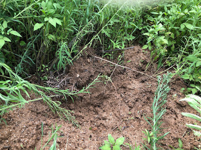 | 足跡もしっかり付いていたのでここを掘り返してそんなに時間は経っていないだろう。 出来たらイノシシには遭遇はしたくない。 果樹園では、いつも武器になる剪定ばさみは持ち歩いてはいるのだが。。 |