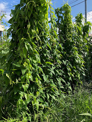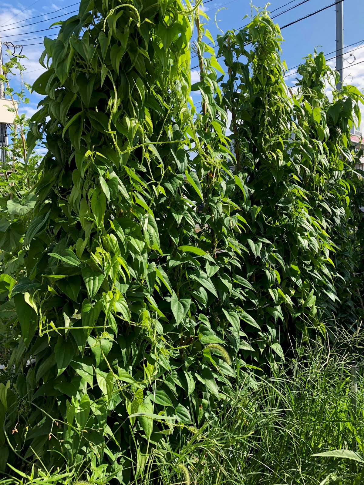 この時期のツクネ芋、しっかり茂って2mの高さの緑の壁になってきた。