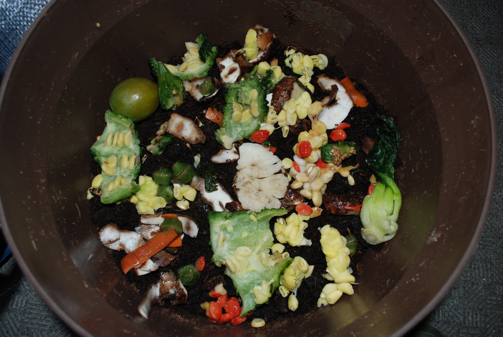 | 取った堆肥はバケツに1が月ほど置いておき、堆肥袋に移します、収穫量は月に2〜3袋といったところでしょうか?袋に移動時、前回救出残しのミミズ君や卵が結構見つかります、彼らはたいてい実験用の透明ガラス瓶に入れられることになります。 |