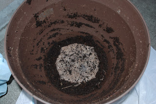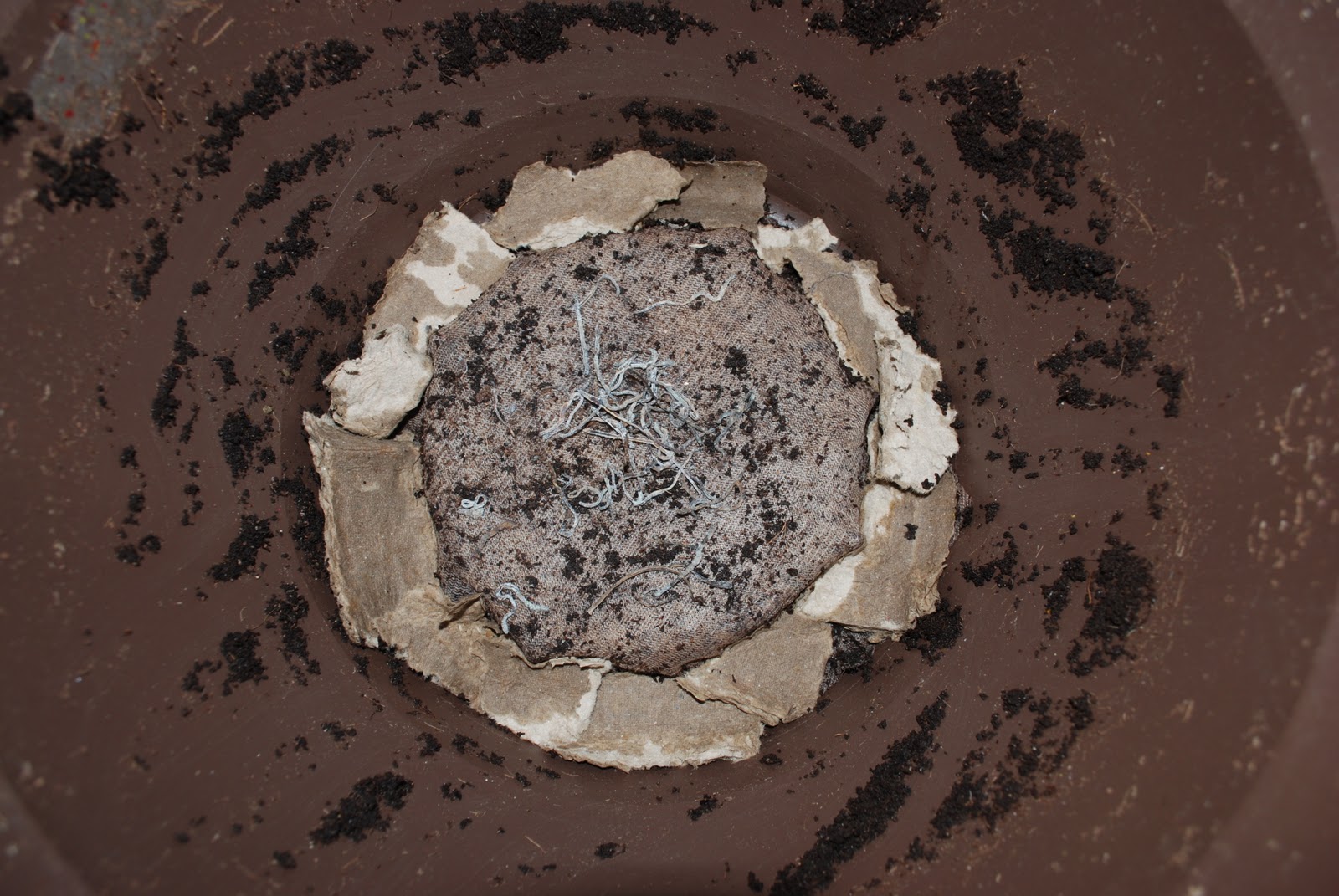 | 移した直後のコンポスト真ん中にミミズ脱出予防のネット(ランドリーネットを適当サイズに切って使用)が見えています |