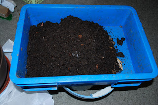 | こちらが箱に移した堆肥、前回投与した餌が残っていることもあります。ここから少しづつ取り分けて |