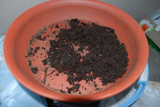 | 今日は普通サイズのミミズ小屋プラコン4号の堆肥取りをしたので我が家の堆肥取り風景紹介します。手前にあるのが作業用腰掛け。真ん中上に見えるミミズ小屋を右上の箱に移したところです。 |
