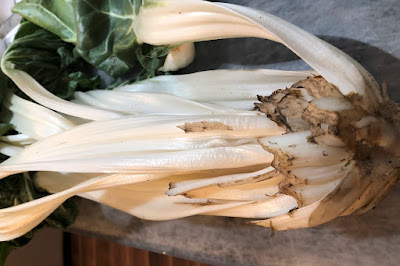 | 最近のスイスチャードはこんな感じで一株をそのまま収穫。 株の下の方にはこれまで1枚1枚葉を収穫した跡が残っている。 |
