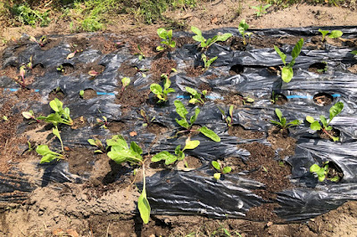 | タマネギを片付けたこの畝に二つの野菜の苗を植えた。 この時期は成長が早いので、あと1ヶ月もしたら収穫が出来始めるだろう。 |