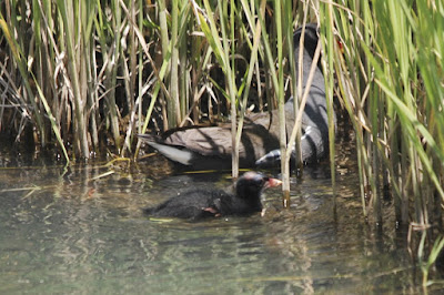 私の姿が見えても逃げることがなかったバンの親子が、今日は珍しく葦の草陰に隠れていた。