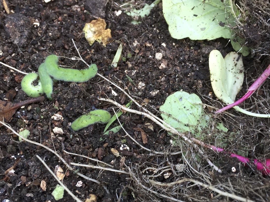 苗を片付けていると、こんなアオムシがいっぱい葉から落ちてきた。