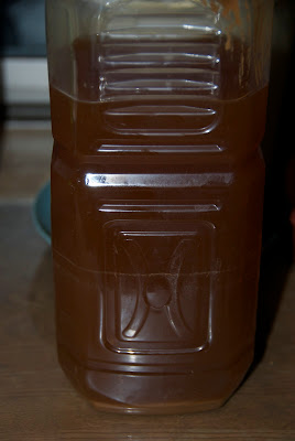 そして、下の写真が作ったばかりの3本目、すなわち、米のとぎ汁と糖蜜液、さらにEM1をペットボトルに入れた直後のものだ。この液のPHは5.9だった。