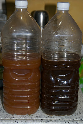 | 2本目(右側)は米のとぎ汁が少し少なめだったので全体量が少なめ。 それでもこれもマニュアリ通り1本目から1/10量を移動させて作っている。 さてどんなになるか? |