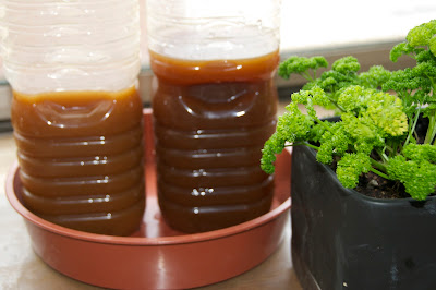 | 不完全な発酵液でも植物に毒性はないだろうと、希釈して植物に与えている。 左の1本目の液が減っているのはそのためだ。 この液のため?かどうかは分からないが最近右に見えるパセリの葉の色が悪くなった。 |